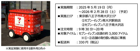 LOMBY 株式会社(代表取締役:内山 智晴、以下 LOMBY)、株式会社セブン-イレブン・ジャパン (代表取締役社長:阿久津 知洋、以下セブン-イレブン)、スズキ株式会社(代表取締役社長:鈴木 俊宏、以下スズキ)は、5 月 19 日(月)から東京都八王子市の南大沢エリアにて、セブン-イレブンの商品 お届けサービス『7NOW』でご注文いただいた商品を屋外型自動走行ロボット『LOMBY』でお届けする実証実験 を開始いたします。なお、本実験では配送先地点を指定せず、対象のセブン-イレブン 2 店舗を中心とした 南大沢エリア全域の個人宅(集合住宅の場合はエントランス周辺※2)等まで配送することから、国内の屋外 ロボット配送における配送可能エリアと対象戸数は最大規模※1 となります。