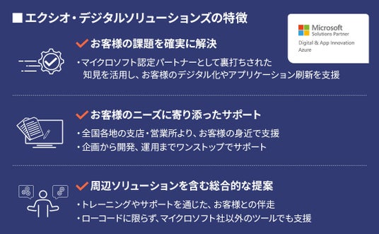 エクシオ・デジタルソリューションズ株式会社は、システムソリューション分野におけるコンサルティングから設計・開発・運用の全般にわたる技術と知見を最大限に発揮し、お客様の課題解決・デジタルトランスフォーメーションの推進に取り組んでまいります。