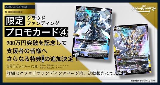 「トリニティドラフト」クラウドファンディングが900万円を突破したことを記念し、限定プロモーションカードの第4弾として、特別バージョンのプロモカード2枚を追加いたしました。今回のプロモカードは、ゲーム本体をご支援いただいた方々への完全限定アイテムであり、モリチカシュウト様とTKC様によるイラストを使用したカードの特別仕様となっております。