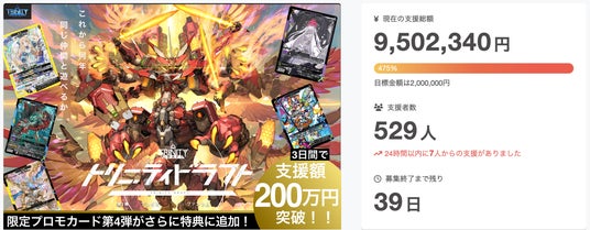 京都の太秦で50年以上にわたり染色用粘着テープの卸売業や印刷サービスを展開する株式会社三木盛進堂(代表者:三木幸彦)は、トレーディングカードゲーム(TCG)の要素を取り入れた、新ジャンルのカードゲーム「リミテッドトレーディングカードゲーム(LTCG)」第1弾『トリニティドラフト』のクラウドファンディングを2/26(水) 20:00より実施し、支援額900万円を突破致しました。このゲームは、現在のトレーディングカードゲームバブルが引き起こす問題を解決するため、全カードセット売りで販売される3人プレイ専用カードゲームです。
