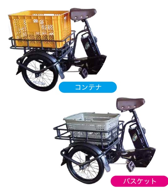 前にはバスケットを装備し、後部には専用のフレーム枠を設置。市販のスーパーの買い物カゴやコンテナをそのままセットでき、シーンに応じて使い分けすることができます。