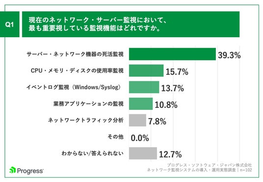 「Q1.現在のネットワーク・サーバー監視において、最も重要視している監視機能はどれですか。」(n=102)と質問したところ、「サーバー・ネットワーク機器の死活監視」が39.3%、「CPU・メモリ・ディスクの使用率監視」が15.7%、「イベントログ監視(Windows/Syslog)」が13.7%という回答となりました。