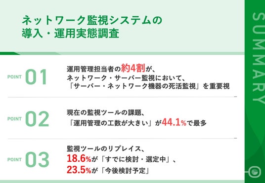 まず、運用管理担当者の約4割が、ネットワーク・サーバー監視において、「サーバー・ネットワーク機器の死活監視」を重要視している一方で、現在の監視ツールの課題として、「運用管理の工数が大きい」(44.1%)などを挙げました。また、現在の監視ツールの見直しや他製品への置き換えについては、18.6%が「すでに検討・選定中」、23.5%が「今後検討予定」と回答しています。
