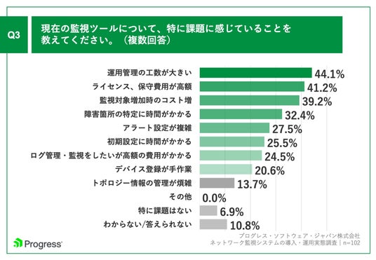 「Q3.現在の監視ツールについて、特に課題に感じていることを教えてください。(複数回答)」(n=102)と質問したところ、「運用管理の工数が大きい」が44.1%、「ライセンス、保守費用が高額」が41.2%、「監視対象増加時のコスト増」が39.2%という回答となりました。