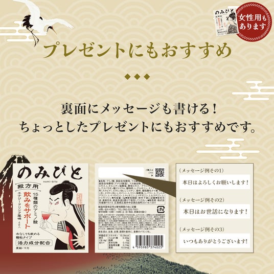 このような時代の背景の中で、より男性の健康的な飲酒の促進が必要不可欠という思いから、男性用アルコール対策サプリメント「のみびと(殿方用)」の開発に至りました。