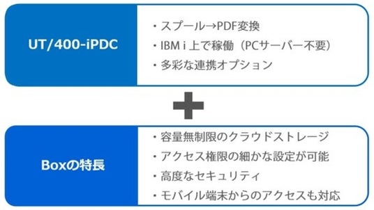 さらにBoxアダプターは、IBM i向け高機能グラフィカルPDF作成ツール「UT/400-iPDC」、スプールファイルからCSVやXLSXを作成する「UT/400-SDP」、DBからCSV、XLSX、jsonなどのオープンフォーマットファイルを作成する「i-D2CX」と連携可能です。
