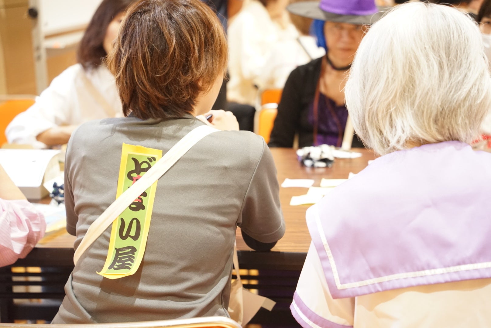 啓発ウォークでは、お互いのネームカードにサインし合うなど、交流の工夫をしました。仮装の投票も