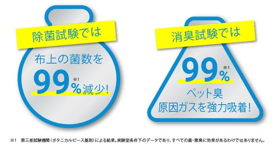 本製品は独自配合の植物由来成分と、先端技術(ナノテクノロジー)で開発されたナノ粒子化した合成ゼオライトが、ペット臭や菌をスピード除去。第三者機関の試験では、それぞれ99%以上の除去・吸着率を記録しています。