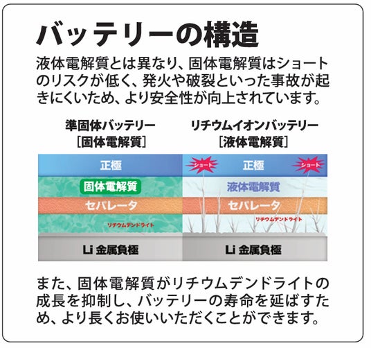 革新的な準固体バッテリーを採用することで、安全性を従来製品より大きく向上させ、より安心してお使いいただけます。