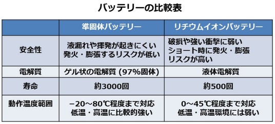 落下や衝撃での燃焼や液漏れの心配が少なく、リチウムイオン電池よりも安全性に優れています。