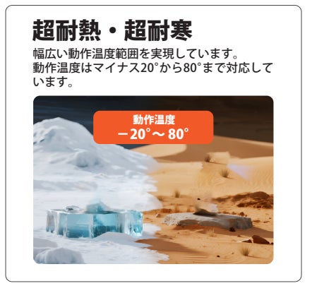 また、高温・低温環境にも強く、幅広い動作温度範囲を実現しています。さらに、充放電回数にも優れており、約3,000回のバッテリーサイクルを実現しています。