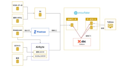 ECサイト運営には、多数のプラットフォーム(Amazon、楽天市場、Yahoo!など)やシステム(CRM、ERP、在庫管理ツール)からのデータ収集が必要です。AirbyteとFivetranは、豊富なコネクタを提供しており、これらのデータを簡単に統合できます。