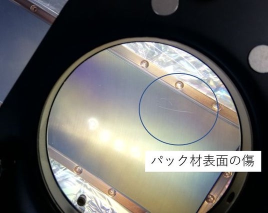 パック材表面の傷か、製品の傷か梱包後では判別しにくいが、位相偏光フィルターによるハレーション抑制によって観察対象がクリアに見えます