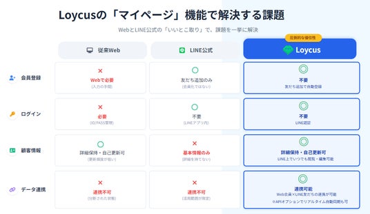 Loycus株式会社(本社:東京都千代田区、代表取締役:嶽本泰伸、以下「当社」)が提供する、LINEを活用した顧客エンゲージメント支援ツール「LOYCUS(ロイカス)」は、LINE公式アカウントを活用し、ユーザー自身が会員情報を閲覧・編集できる新機能「マイページ機能」の提供を開始しました。本機能は、LINE公式アカウントを起点としたユーザー識別により、ID・パスワードなどのログイン情報の入力を不要とし、ユーザーが自身の情報をいつでも確認・更新できる仕組みを実現しています。