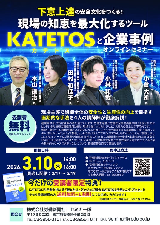 株式会社労働新聞社(代表取締役社長:森川泰孔)は、2026年3月10日(火)に受講料無料のオンラインセミナー「下意上達の安全文化をつくる!~現場の知恵を最大化するツール『KATETOS(カテトス)』と企業事例~」を開催します。