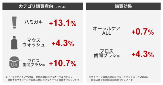 ※1:「ドラッグストアVOICE」配信店舗におけるオーラルカテゴリ購買者とサイネージ非設置店舗におけるオーラル購買者での購買意向リフト率をアンケート調査により算出
