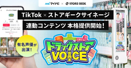 株式会社ストアギーク(本社:東京都港区、代表者:代表取締役 廣瀬 隆昌、以下「ストアギーク」)は、リテールメディアサービス「ストアギークサイネージ」において、株式会社マイナビ(本社:東京都千代田区、代表者:代表取締役 社長執行役員 土屋 芳明、以下「マイナビ」)と共同で、人気声優を起用したTikTok連動型コンテンツ『ドラッグストアVOICE』のメーカー様向け提供を本日より開始しますので、お知らせいたします。