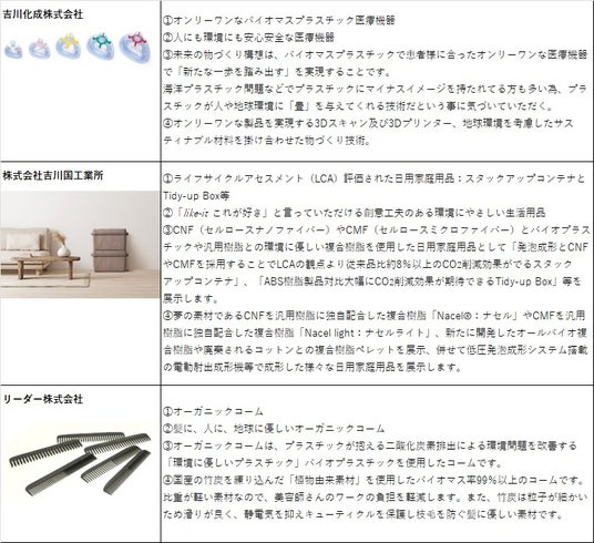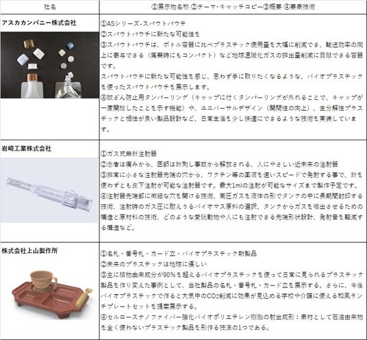 石油由来のプラスチックから植物由来や生分解性のバイオプラスチックへと転換を図ることをめざし、18社がそれぞれに製品・技術を提案します。また、バイオプラスックの採用だけでなく、農業廃棄物と混合した“バイオ×バイオ”素材なども登場。プラスチックは固体や粉体を組み合わせると成形の難易度が高まるのが常ですが、循環型社会へとつなげるための技術的な壁を乗り越え、実用化への道を着実に進んでいます。