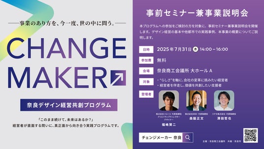 奈良商工会議所(本社:奈良県奈良市西大寺南町8-33、会頭:小山新造)は、奈良市と共に[奈良市の事業者の強みを価値へと再構築するプログラム]と題して【CHANGE MAKER 奈良デザイン経営共創プログラム】への参加者募集の為に、令和7年7月31日(木)に奈良商工会議所で、事前セミナー兼事業説明会を開催いたしました。この説明会では、デザイン経営の基本や他都市での実践事例、すでに取り組まれている事業者の「生の声」を通じて、参加者へ事業の理解を深めました。