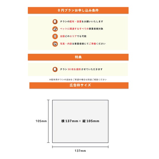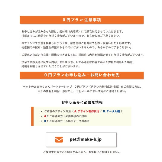 「ペットのおまわりさん」パートナーシップ0円プランについて、詳細は以下の通りです。お申し込み条件や広告枠サイズ、掲載イメージデザインのパターンについてもご確認ください。