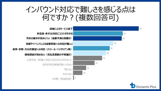 インバウンド対応で難しさを感じる点として、最も多かったのは「混雑によるサービス低下」。次いで「多言語・多文化対応にコストがかかる」、「予約の集中が読みにくい」が続きました。