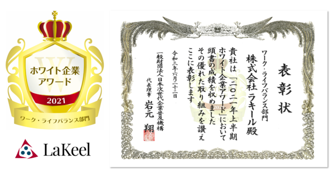 株式会社ラキール(本社:東京都港区、代表取締役社長:久保 努、以下「ラキール」)は、一般財団法人日本次世代企業普及機構(通称:ホワイト財団)が主催する『第6回ホワイト企業アワード』において、「ワーク・ライフバランス」部門で受賞し、ホワイト企業認定を受けたことをお知らせいたします。