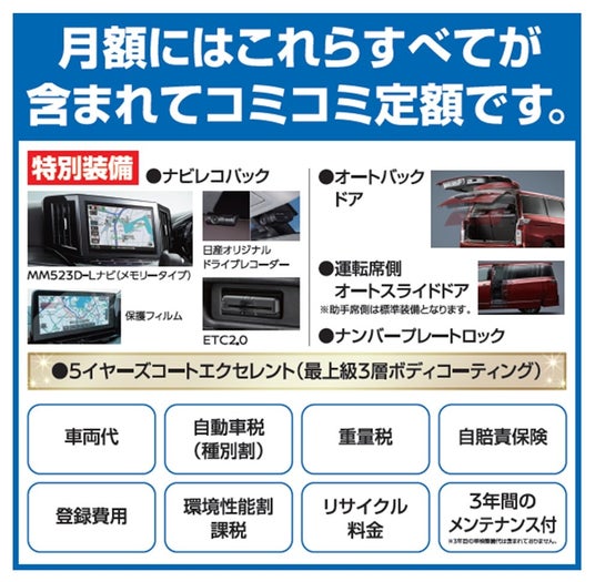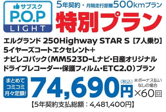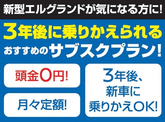 ・頭金0円、コミコミの月々定額でエルグランドブランドを楽しめる