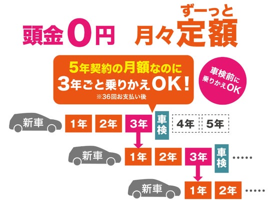 ・5年契約でも3年後(車検取得前)に新車への乗りかえが可能。