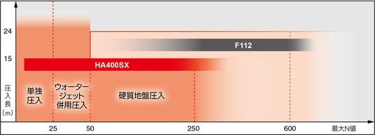 1台の機械で「単独圧入」、「ウォータージェット併用圧入」、「硬質地盤圧入」の3種類の工法が選択できる、複合式の U形鋼⽮板400 mm幅対応機です。特に需要の高いN値(地盤の硬さ)50~250程度の砂礫層・玉石層等に最適な軽量・コンパクトな機械となっており、N値250~600程度の地盤をターゲットとした「サイレントパイラー(TM) F112」より2450kg軽量化。高い機動性を実現しています。