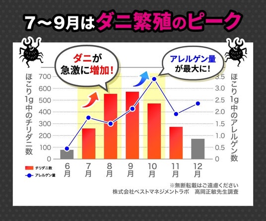 気温と湿度の上昇で家中の布団やソファ、カーペットのダニが急激に増殖する7~9月。夏場に増えたダニは秋口に大量に死骸となり、フンと一緒にアレルゲンとなって家中を漂います。それを防ぐには夏の間に生きたダニ対策をしっかりすることが不可欠です。