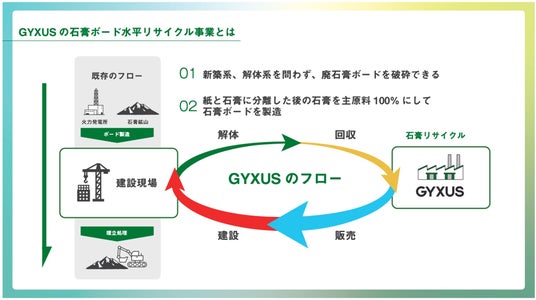 GYXUSは、建設廃棄物の中で再資源化が難しいとされてきた石膏ボードの100%水平リサイクル※1の独自技術を開発し、都道府県単位で循環させる**「石膏ボードの地産地消型資源循環モデル」**を全国および海外へ展開するスタートアップ企業です。