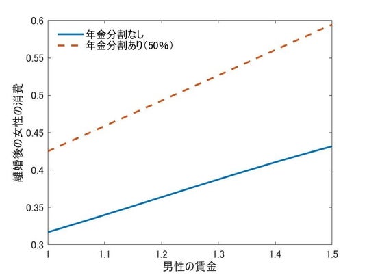 南村准教授は今回の研究で男性のみが働くケースに焦点を当て、先行研究を基に協議離婚のもとで年金分割制度が貯蓄や離婚の意思決定に与える影響を分析(モデル分析)。さらに、このモデルについて、離婚率、貯蓄率、離婚後の男女の消費量に与える影響をシミュレーション分析しました。