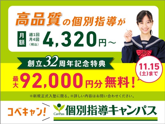 「コベキャン」「キャンパス」の愛称でおなじみの個別指導キャンパスは、低価格で高品質な個別指導塾です。他の個別指導塾の6割程度の授業料を創業当初から維持しています。大阪・兵庫・京都・滋賀・奈良・愛知・愛媛・東京・千葉・埼玉・福岡に直営校舎を展開中。成績が上がらなければ3ヶ月間授業料免除となる成績保証制度を業界でもいち早く導入し、「絶対に成績を上げる」をモットーに、地域に密着した教室展開をしています。当塾の8割が友人同士の紹介や口コミからのご入塾で、高い評価をいただいております。