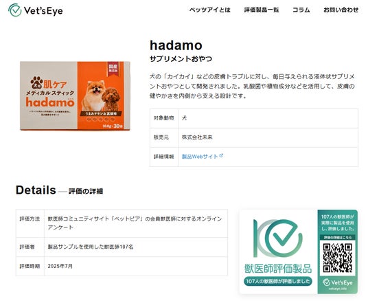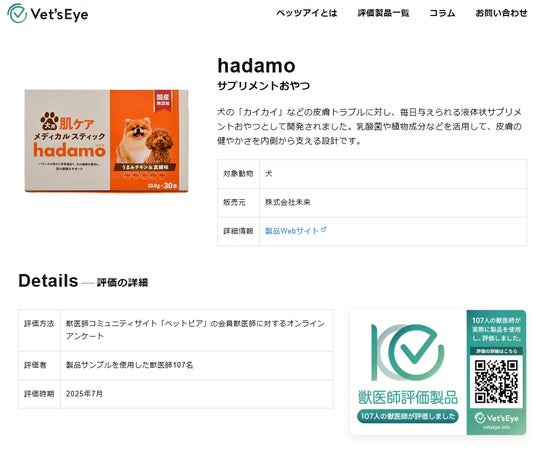 株式会社未来(本社:愛知県名古屋市)は、犬用サプリメントおやつ「hadamo」と、犬用完全栄養食「FULLMEAL」について、107名の獣医師による評価データを公開いたしました。