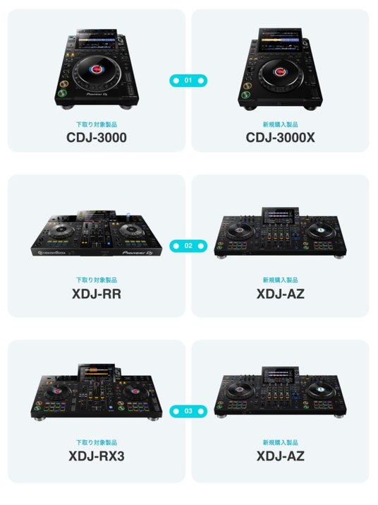 初期展開では、「CDJ-3000X」への買い替えに伴う「CDJ-3000」の下取り、および「XDJ-AZ」への買い替えに伴う「XDJ-RR」「XDJ-RX3」の下取りを開始します。