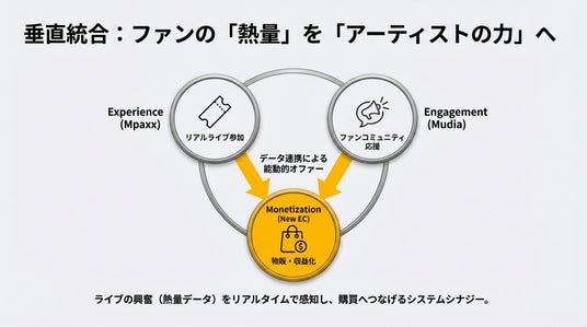 ソナーユーは、定額制ライブ行き放題サービス「Mpaxx(エムパス)」や、オーディエンス参加型イベントメディア「Mudia(ミューディア)」を通じて構築している「リアルなライブを愛するファンコミュニティ」を、今回譲受したEC事業と連携させます。これにより、単なるツールの提供に留まらず、プラットフォームが能動的にファンとの接点を創出する「成長支援型(伴走型)EC」を展開していきます。