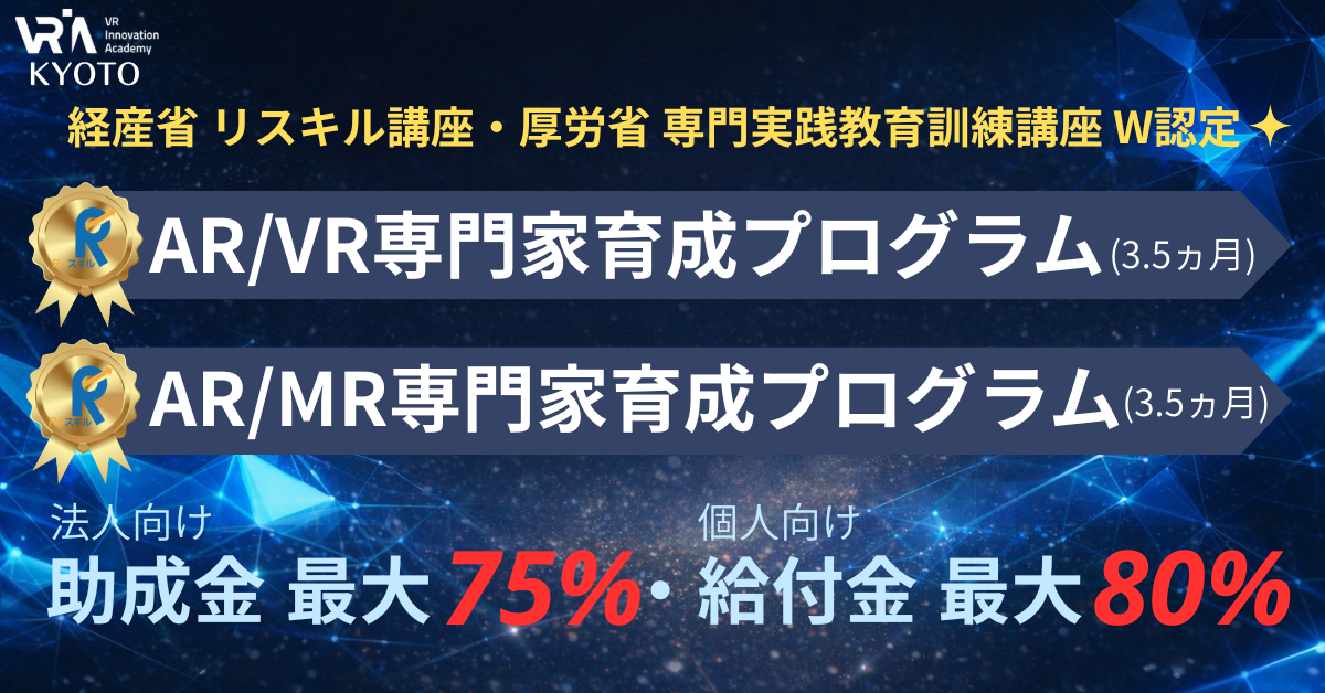 株式会社クロスリアリティ(本社:京都市下京区、代表取締役社長:齋藤公男)が運営する、VRイノベーションアカデミー京都(以下「VRIA京都」または「当校」)が提供する、「AR/VR専門家育成プログラム」「AR/MR専門家育成プログラム」(以下「本講座」)は、2講座ともに経済産業省 「リスキル講座(第四次産業革命スキル習得講座)」認定、厚生労働省「専門実践教育訓練講座」指定となりました。(「AR/VR~」は再認定)これにより、個人受講者は専門実践教育訓練給付制度を活用することで、受講料の最大80%の給付を受けることが可能です。また、法人受講者においては、人材開発支援助成金を活用することで、受講料の75%(大企業は60%)の助成に加え、賃金助成も得ながら、社員のリスキルやDX人材育成が可能となります。