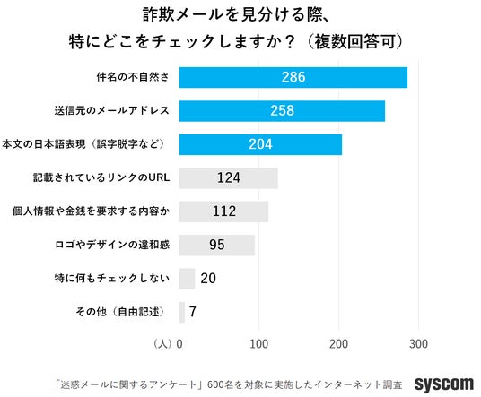 「詐欺メールを見分ける際、特にどこをチェックしますか?」の質問では、「件名の不自然さ」が1位で286人、2位に「送信元のメールアドレス」258人、3位に「本文の日本語表現」204人と続きます。
