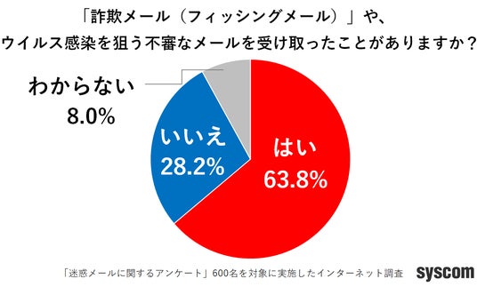 ランサムウェアなど、コンピューターウイルスによる被害が注目をあびる昨今、一般の人を対象とした「ネット通販サイト、宅配業者、銀行などを装った『詐欺メール(フィッシングメール)』や、ウイルス感染を狙う不審なメールを受け取ったことがありますか?」という質問では、「はい」が383人(63.8%)、「いいえ」が169人(28.2%)、「わからない」48人(8.0%)という結果でした。