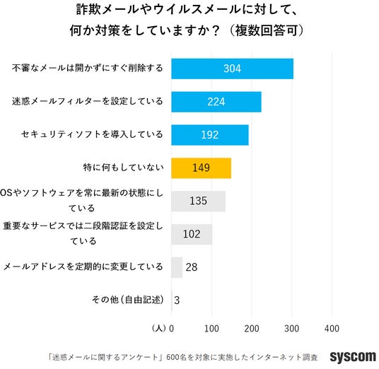 「不審なメールは開かずにすぐ削除する」が304人でトップ、「迷惑メールフィルターを設定している」が224人で2位、「セキュリティソフトを導入している」が192人で3位でした。