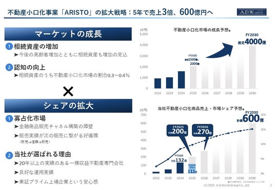 ADWの不動産小口化商品「ARISTO」の、2025年度における年間販売総額の目標は200億円、次年度である2026年度は270億円、そして2030年度には600億円まで成長を続けます。