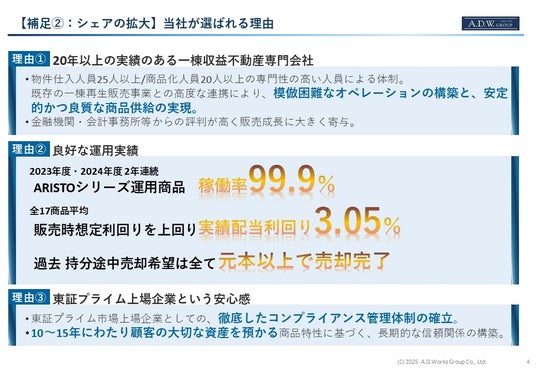 2025年6月30日付リリース「エー・ディー・ワークスの不動産小口化商品「ARISTO」上半期販売総額 前年同期比170% 企業成長を牽引」のとおり、ADWの不動産小口化事業は急成長を遂げており、当社グループ全体の企業成長を牽引しています。