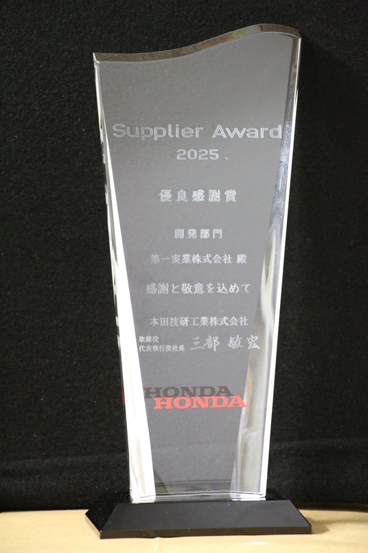 総合機械商社の第一実業株式会社(本社:東京都千代田区、代表取締役 社長執行役員:船渡雄司、以下「当社」)は、本田技研工業株式会社(本社:東京都港区、取締役代表執行役社長:三部敏宏、以下「本田技研工業」)より優良感謝賞 開発部門を受賞しました。
