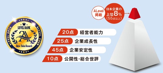 株式会社東京商工リサーチが実施する企業調査で評点が55点以上の企業かつ非上場の企業から厳選して掲載しています。「評点」とは、対象企業を「経営者能力」「成長性」「安定性」「公開性・総合世評」の4つの視点で評価するTSR独自の指標です。その総合点を5つのランクで位置づけています。