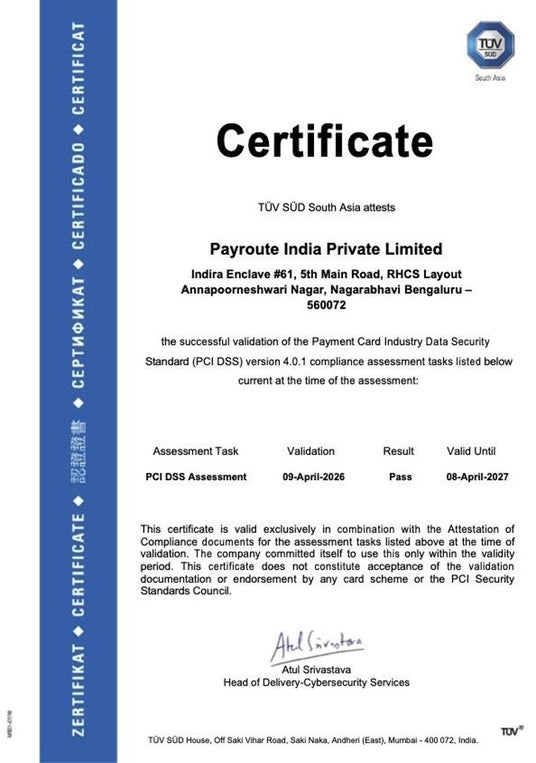 株式会社PAY ROUTEのインド現地子会社であるPayroute India Private Limitedは、クレジットカード業界における国際的なセキュリティ基準であるPCI DSS(Payment Card Industry Data Security Standard)の準拠に達成したことをお知らせいたします。