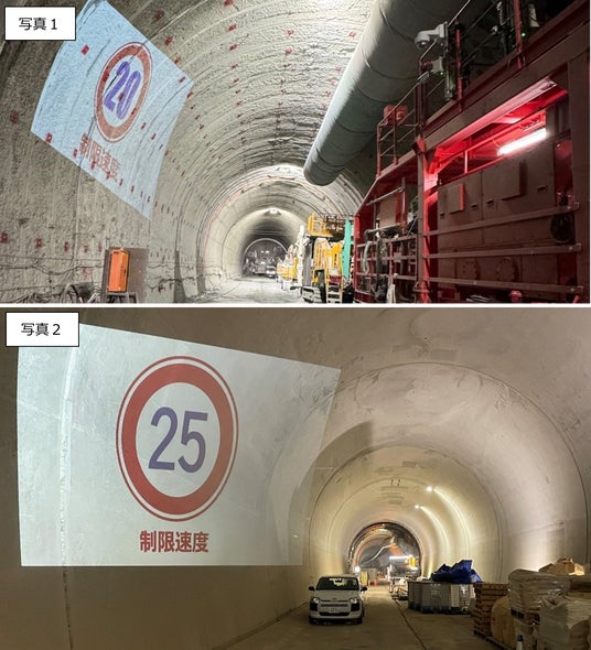 ○トンネル投影箇所から8m程離した車両通行の邪魔にならない場所に機器を設置し、プロジェクションマッピングのように大きく鮮明な標識表示が行えること(写真1)