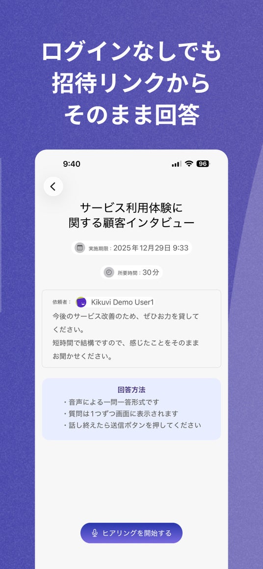 株式会社Kikuvi(本社:神奈川県鎌倉市、代表取締役社長:佐藤拳斗、以下「Kikuvi」)は、質問からインサイト抽出までを自動化するAIヒアリングSaaS「Kikuvi」において、iOSアプリ版をリリースしたことをお知らせいたします。