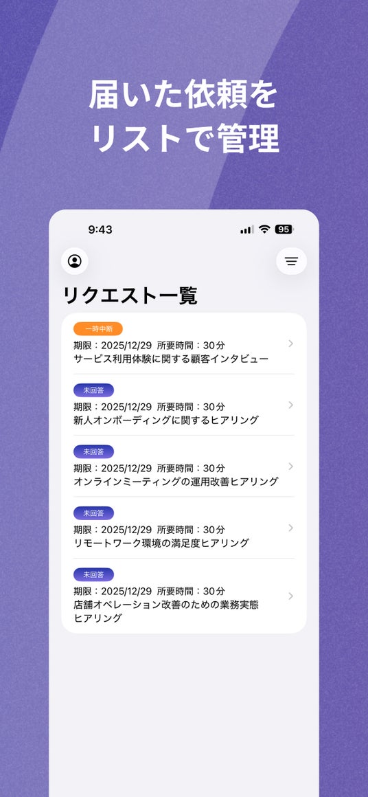 PC・ラップトップ不要: スマートフォンさえあれば、アプリをインストールするだけで即座にインタビューに参加可能です。