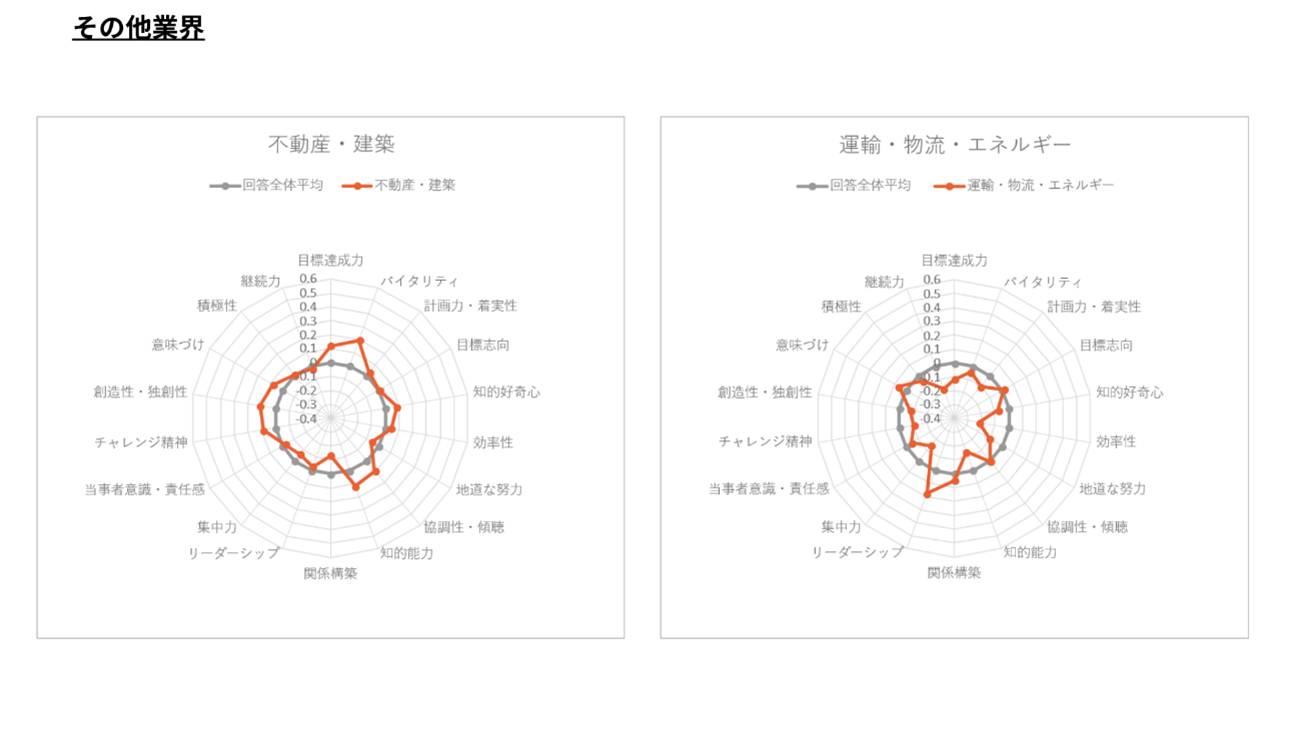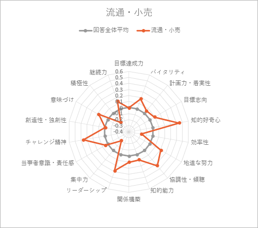 流通・小売では「知的好奇心」「チャレンジ精神」「協調性」「リーダーシップ」が高い一方で、「集中力」は平均よりもやや低め。顧客ニーズや市場トレンドの変化を素早く捉え、新しい商品や販売戦略に積極的に挑戦する意欲、そして現場で協力関係を築く力が際立っています。こうした特徴は、常に変化が求められる流通・小売の現場において、新しいことに前向きに取り組みつつチームで成果を出す姿勢として評価されていると考えられます。(図5)