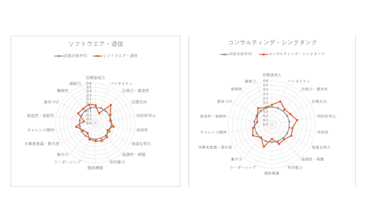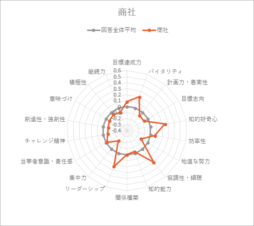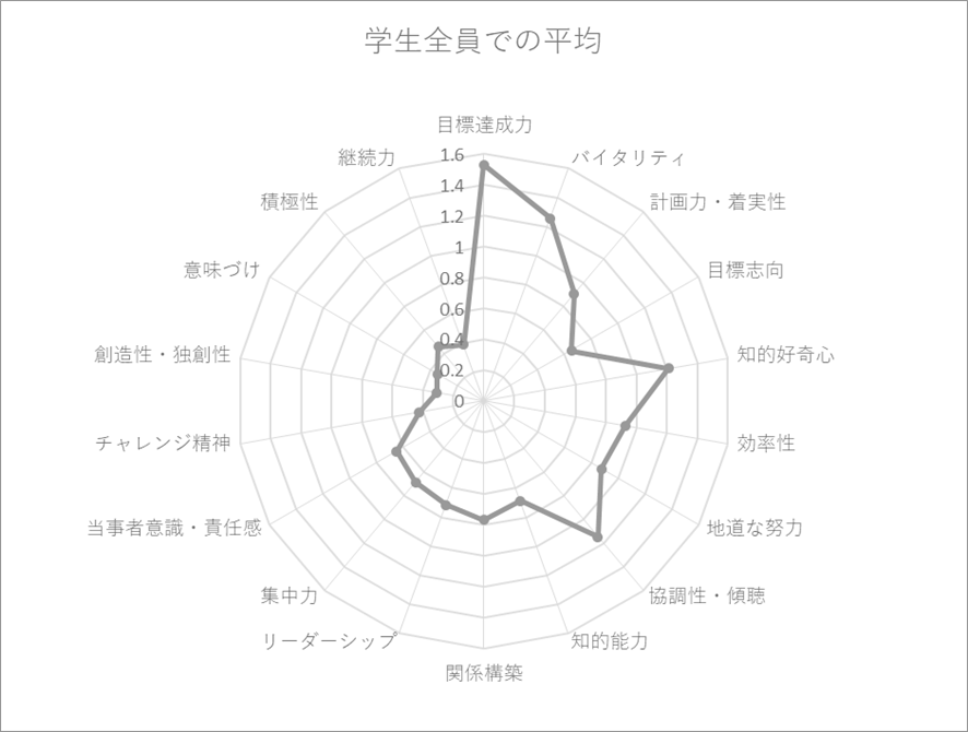 その中でも特に「目標達成力」「バイタリティ」「知的好奇心」「協調性・傾聴」の4つが高く表れています。(図2)